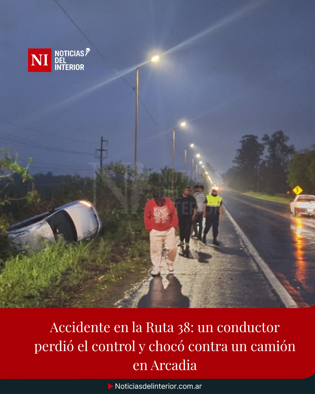 Un accidente de tránsito ocurrido en la madrugada de este sábado 25 de octubre en la Ruta Nacional 38, a la altura del barrio Hipotecario de Arcadia, dejó daños materiales pero ningún herido. El hecho fue reportado por la Comisaría de Arcadia, dependiente de la Unidad Regional Sur.