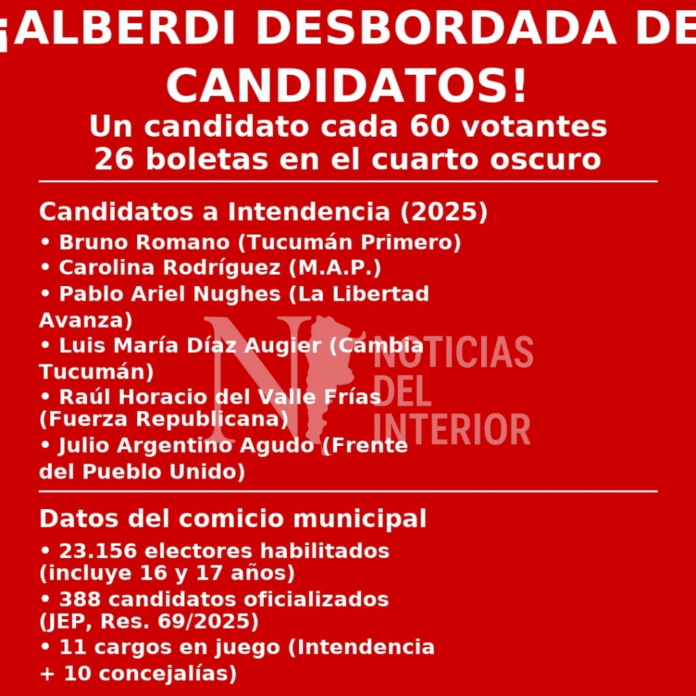 La política de Juan Bautista Alberdi no da respiro. Después de la intervención municipal que dejó afuera al histórico intendente Luis Armando “Pato” Campos, los comicios del 26 de octubre de 2025 marcarán un nuevo récord: 388 candidatos en total para apenas 11 cargos. Eso significa que habrá un postulante por cada 60 vecinos habilitados a votar.