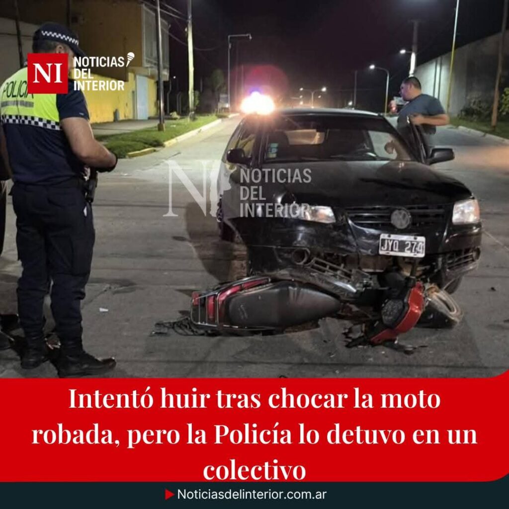 Un joven de 23 años fue aprehendido este sábado por la Policía de Tucumán luego de protagonizar una secuencia delictiva que incluyó el robo de una motocicleta, un accidente y un intento de fuga en un colectivo de línea. El hecho ocurrió cerca de las 21:00 en la ciudad de Juan Bautista Alberdi.