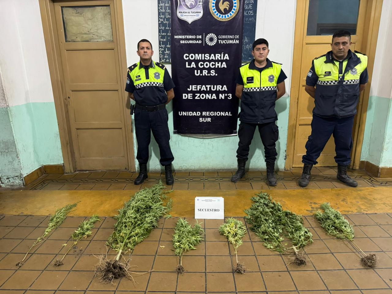 Un operativo de rutina en la madrugada de este jueves derivó en el secuestro de siete plantas de marihuana en la localidad de Huasa Pampa Norte, departamento La Cocha. El hallazgo se produjo cuando efectivos de la Comisaría local acompañaban a una vecina que había solicitado presencia policial por un conflicto familiar.